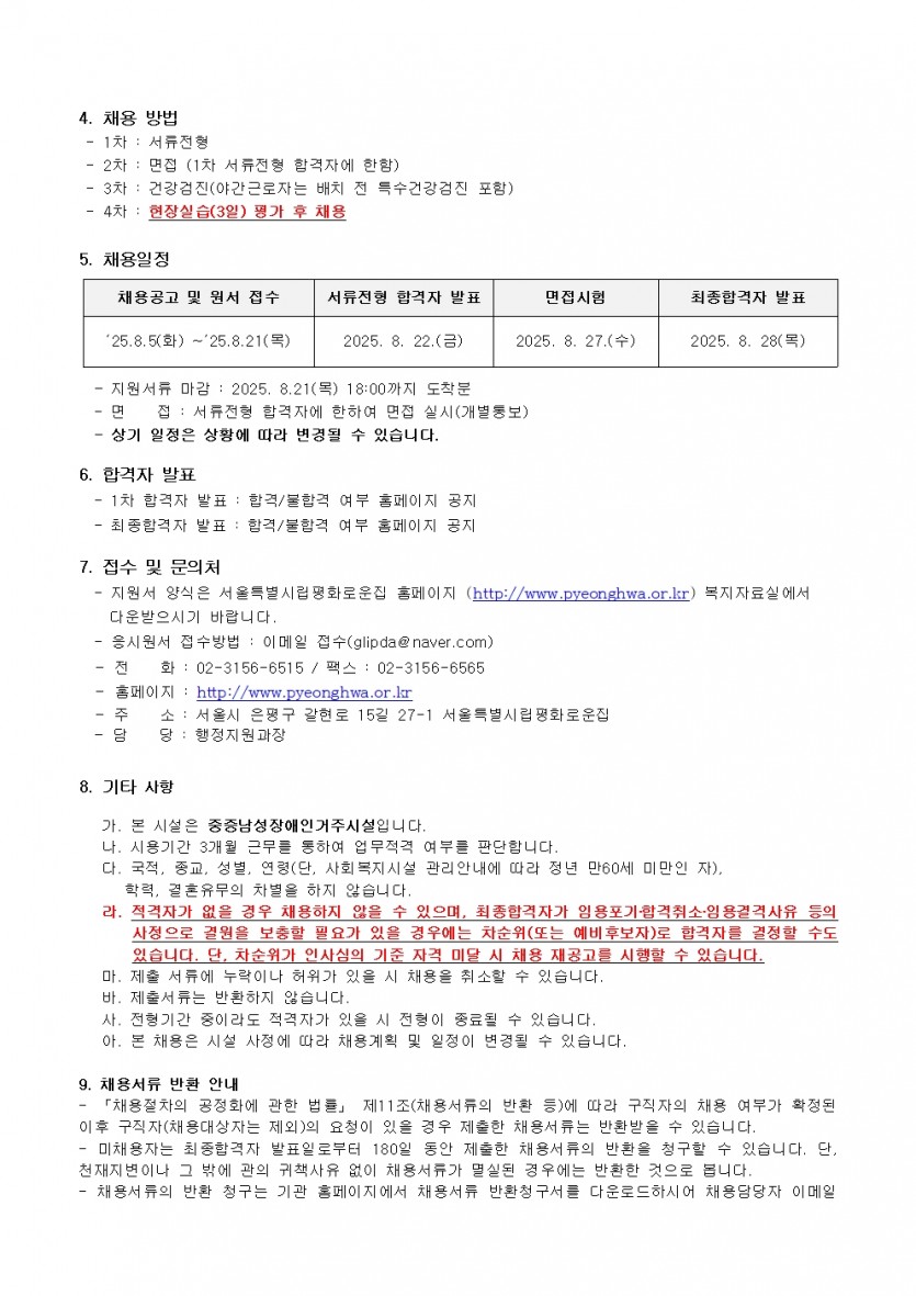 시립평화로운집 제6차 신입직원 채용공고(생활지도원) 페이지 정보 작성자 한동주 작성일 25-08-05 16:09 조회 7,684회 댓글 0건 첨부파일 파일 시립평화로운집 입사지원서이력서,자기소개서및개인정보동의서.hwp (54.0K) 106회 다운로드 DATE : 2025-08-05 16:10:16 파일 2025년 6차 생활지도원채용공고.pdf (68.3K) 100회 다운로드 DATE : 2025-08-05 16:10:16 본문 이전글 다음글 목록 답변