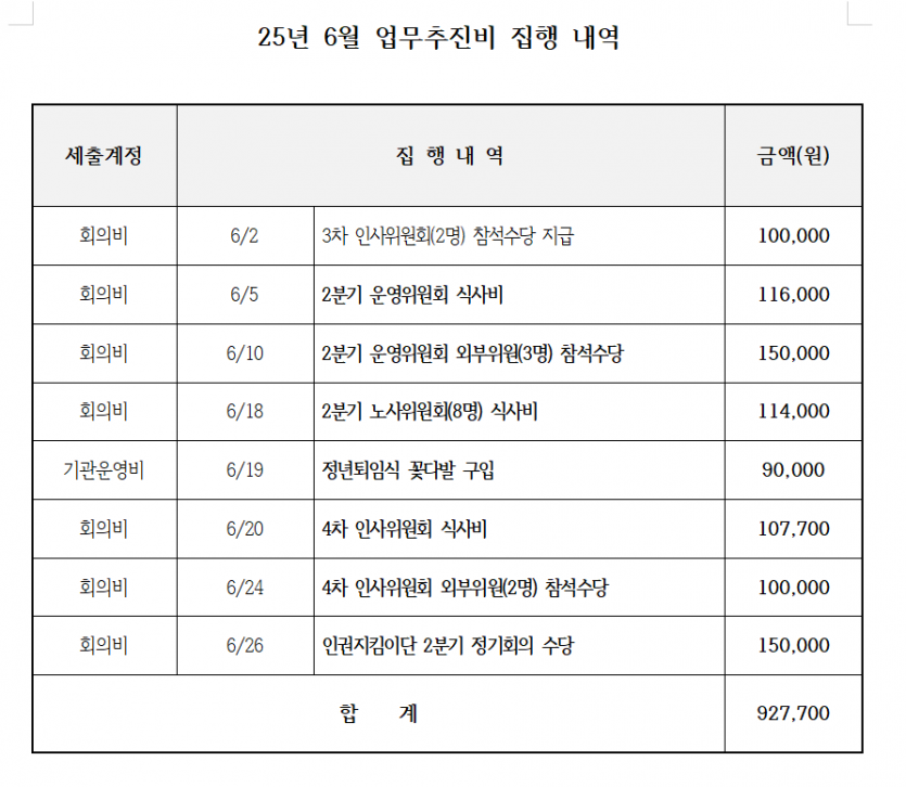 6월 업무추진비 내역공고 페이지 정보 작성자 한동주 작성일 25-07-04 17:35 조회 8,733회 댓글 0건 본문 6월 업무추진비를 다음과 같이 공고합니다. 이전글 다음글 목록 답변