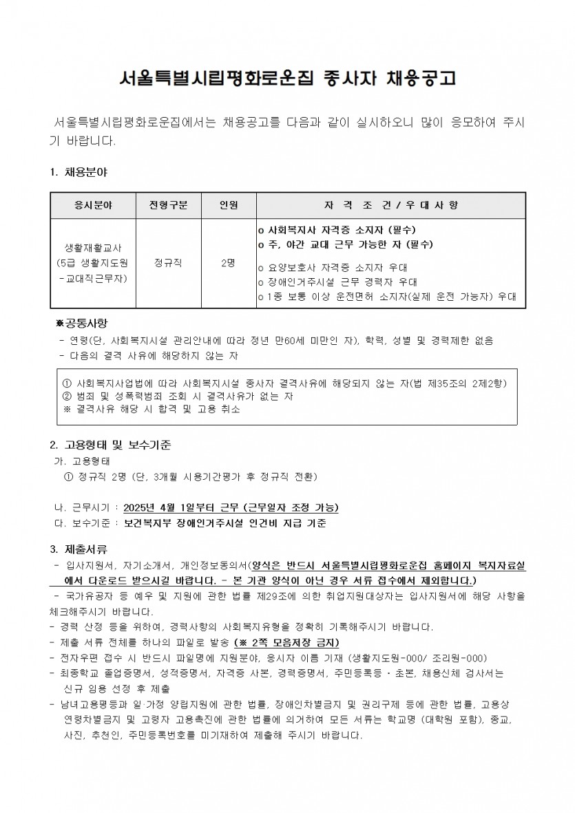 제2차 서울특별시립평화로운집 종사자 채용공고 페이지 정보 작성자 한동주 작성일 25-03-01 10:04 조회 13,484회 댓글 0건 첨부파일 파일 2025년-생활지도원 2차.hwp (58.5K) 154회 다운로드 DATE : 2025-03-01 10:07:51 파일 시립평화로운집 입사지원서이력서,자기소개서및개인정보동의서.hwp (54.0K) 188회 다운로드 DATE : 2025-03-01 10:07:51 본문 이전글 다음글 목록 답변