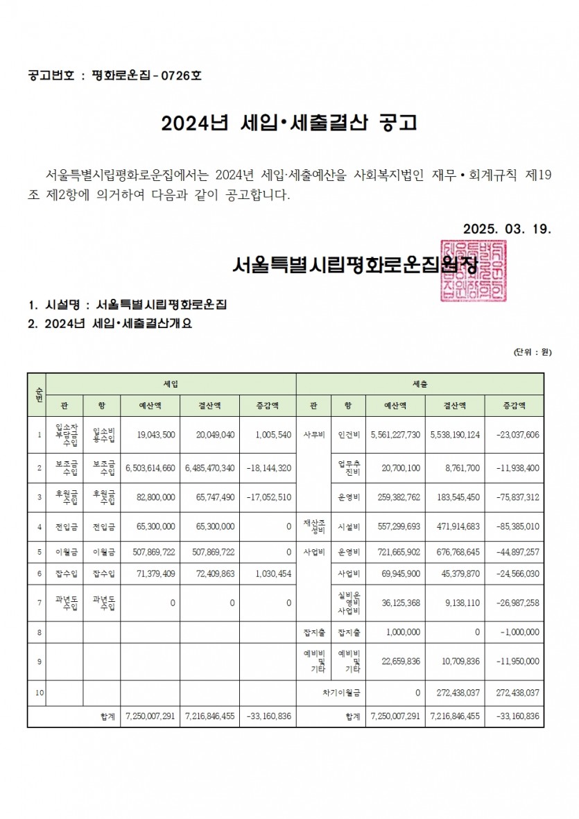 2024년 세입세출 결산서 공고 페이지 정보 작성자 한동주 작성일 25-03-19 13:28 조회 12,504회 댓글 0건 첨부파일 파일 홈페이지2024 세입.세출견결산공고.pdf (48.3K) 138회 다운로드 DATE : 2025-03-19 13:28:29 본문 2024년 세입세출결산서를 다음과 같이 공고합니다. 이전글 다음글 목록 답변