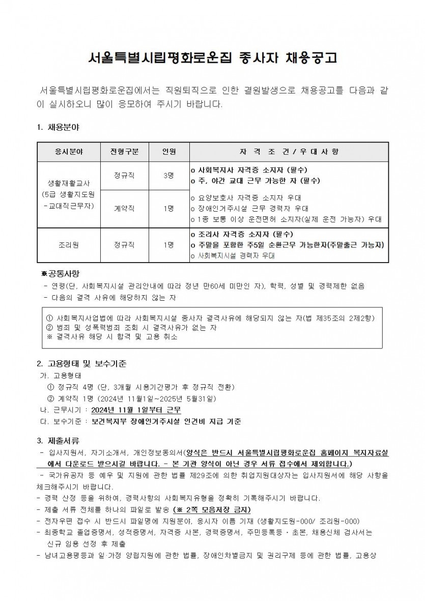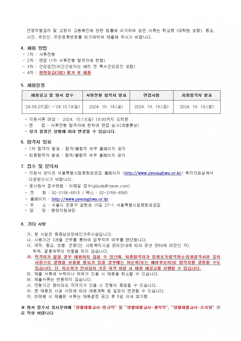 평화로운집 제10차 직원채용공고 페이지 정보 작성자 한동주 작성일 24-09-27 17:36 조회 17,512회 댓글 0건 첨부파일 파일 2024년-생활지도원 10월.hwp (36.5K) 108회 다운로드 DATE : 2024-09-27 17:36:34 파일 시립평화로운집 입사지원서이력서,자기소개서및개인정보동의서.hwp (22.5K) 80회 다운로드 DATE : 2024-09-27 17:36:34 본문 이전글 다음글 목록 답변