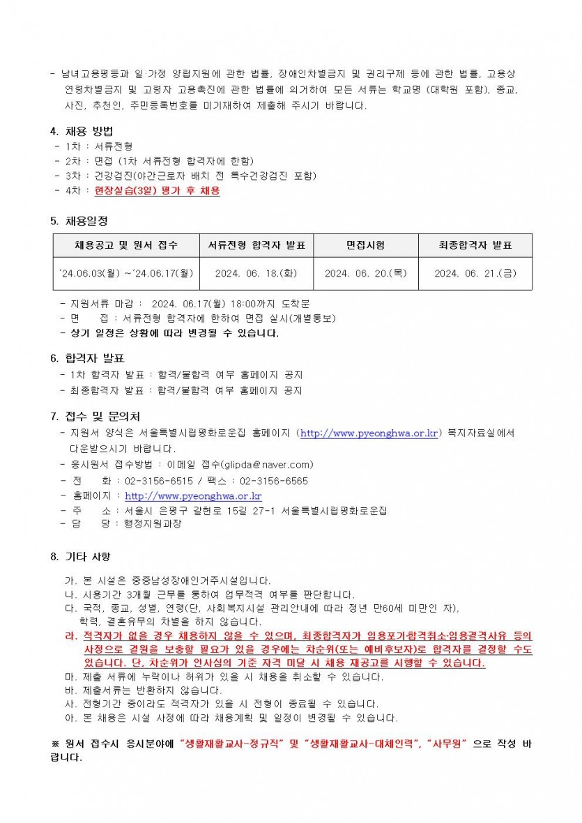 2024년 평화로운집 6차 직원채용 공고 페이지 정보 작성자 한동주 작성일 24-06-03 13:16 조회 18,880회 댓글 0건 첨부파일 파일 시립평화로운집 입사지원서이력서,자기소개서및개인정보동의서.hwp (22.5K) 188회 다운로드 DATE : 2024-06-03 13:16:55 파일 2024년-생활지도원사무원-6월.hwp (36.5K) 126회 다운로드 DATE : 2024-06-03 13:35:52 본문 2024년 평화로운집 6차 직원채용 공고를 다음과 같이 공지하오니 관심있는 분들의 많은 참여 부탁드립니다. 이전글 다음글 목록 답변