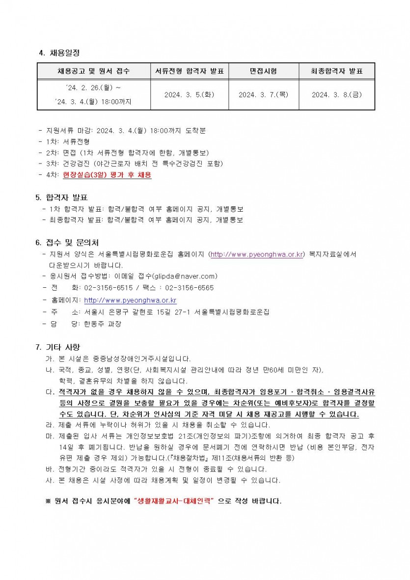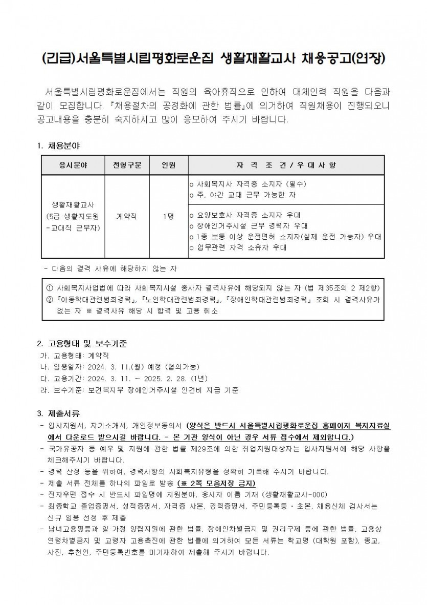(긴급)서울특별시립평화로운집 생활재활교사 채용공고(연장) 페이지 정보 작성자 한동주 작성일 24-02-26 14:43 조회 20,164회 댓글 0건 첨부파일 파일 시립평화로운집 입사지원서이력서,자기소개서및개인정보동의서.hwp (22.5K) 143회 다운로드 DATE : 2024-02-26 14:43:58 본문 이전글 다음글 목록 답변