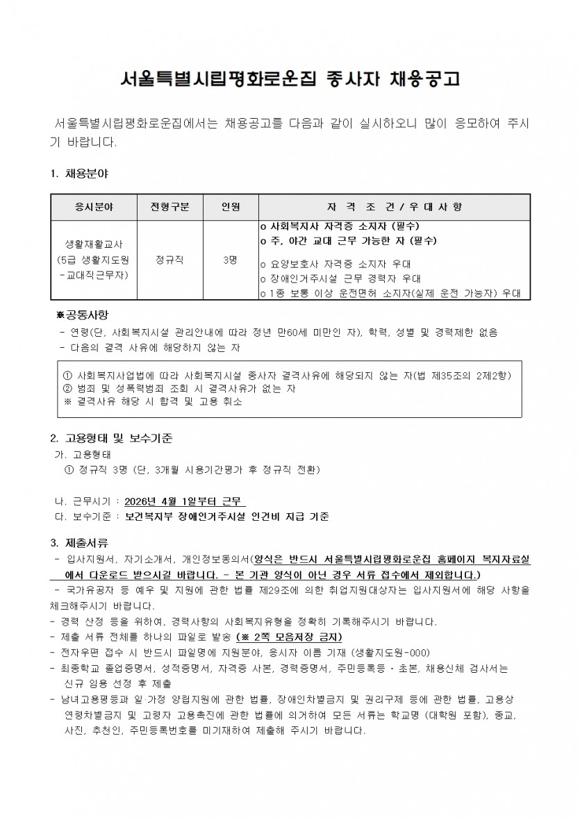 평화로운집 2026년 1차 직원채용공고 페이지 정보 작성자 한동주 작성일 26-03-05 16:17 조회 766회 댓글 0건 첨부파일 파일 2026년 1차 생활지도원.pdf (68.3K) 20회 다운로드 DATE : 2026-03-05 16:49:51 파일 시립평화로운집 입사지원서이력서,자기소개서및개인정보동의서.hwp (54.0K) 16회 다운로드 DATE : 2026-03-05 16:17:33 본문 이전글 다음글 목록 답변