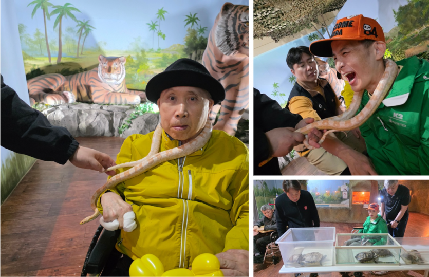 커다란 뱀을 목에 감아보고 매끄러운 촉감을 느껴보았습니다.