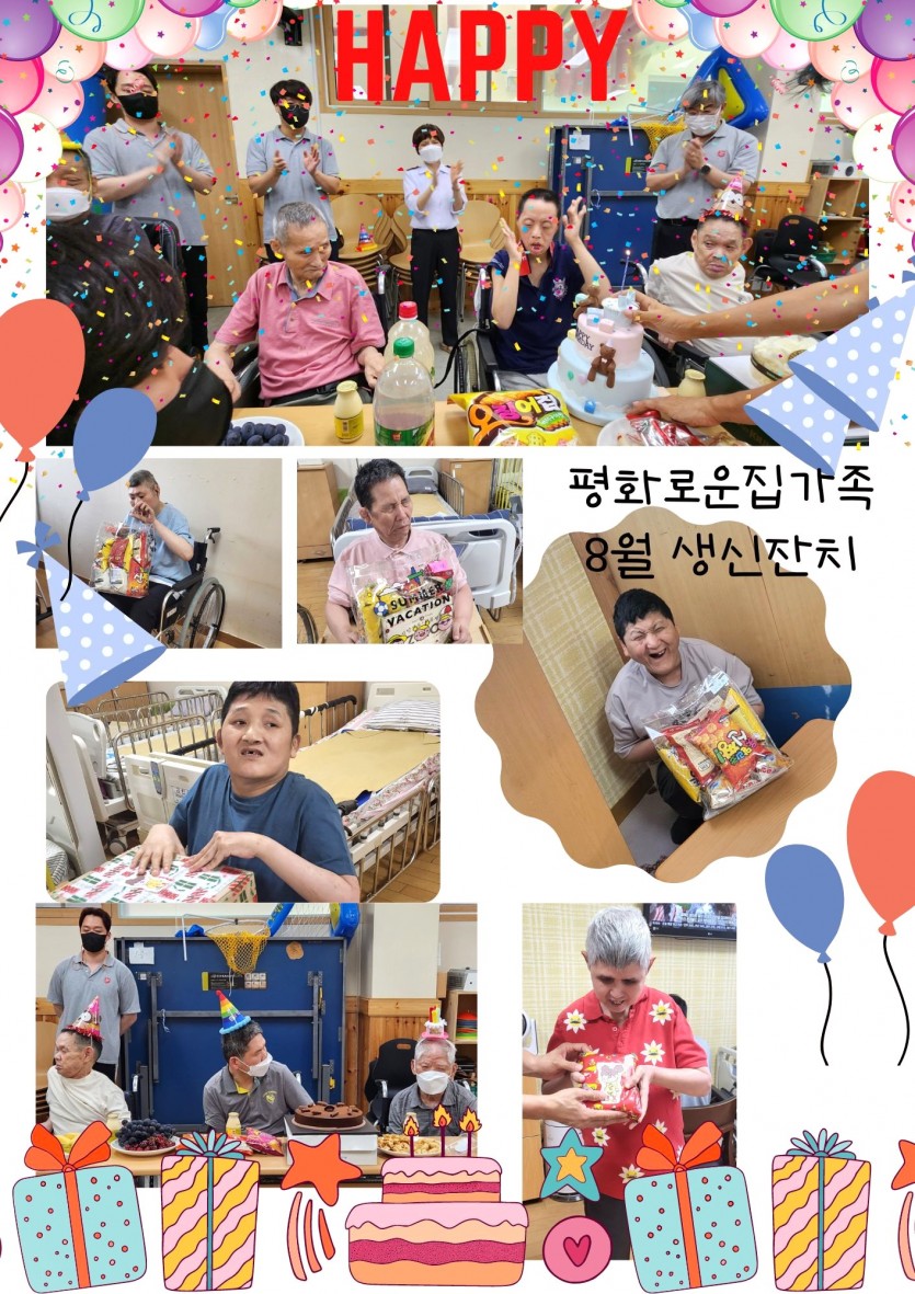 거주인 이야기 | 8월 생신잔치 페이지 정보 작성자 장설궁 작성일 23-08-08 15:39 조회 10,660회 댓글 0건 본문 평화로운집 가족의 8월 생일 잔치^^매년 돌아오는 날이지만항상 새로운 날이기도 하지요?연일 폭염이 지속되어 몸도 마음도 지치지만오늘만큼은 더 많이 웃고, 더 많이 행복하고, 더 많이 사랑받는 날되세요생일을 축하드리며 매일이 기쁨으로 가득 찬 행복한 날들이길 바랍니다. 이전글 다음글 목록