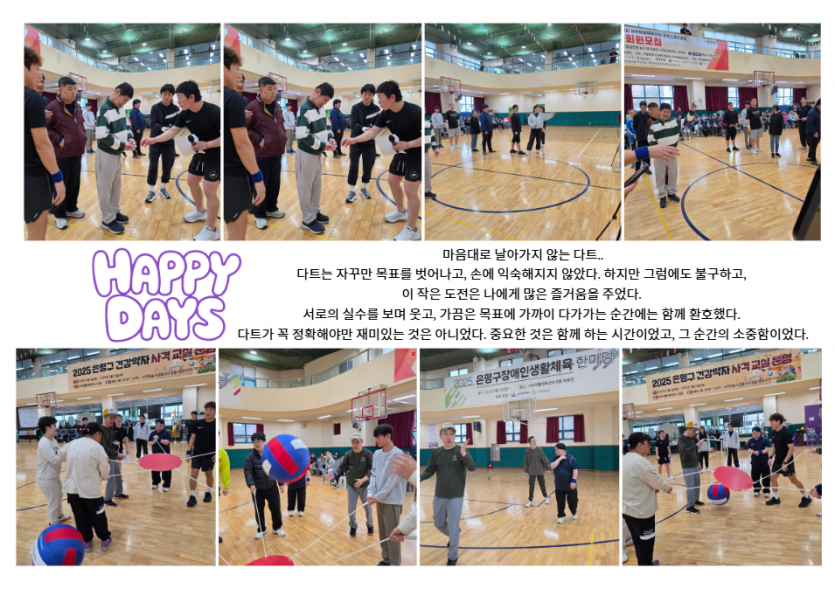 거주인 이야기 | 은평구 생활체육 한마음 페이지 정보 작성자 장설궁 작성일 25-10-27 10:12 조회 2,106회 댓글 0건 본문 은평구 생활체육 한마당에 다녀왔습니다. 여러 친구들과 함께한 시간은 즐거웠습니다.서로의 실력을 겨루기도 하고 응원하며 웃어보기도 하고이런 행사는 지역 사회의 유대감과 건강한 생활을 장려하는 데큰 도움이 되는 것 같습니다. 다음엔 꼭 이길게..라는 한 마디에 내년을 기약해 봅니다. 이전글 다음글 목록