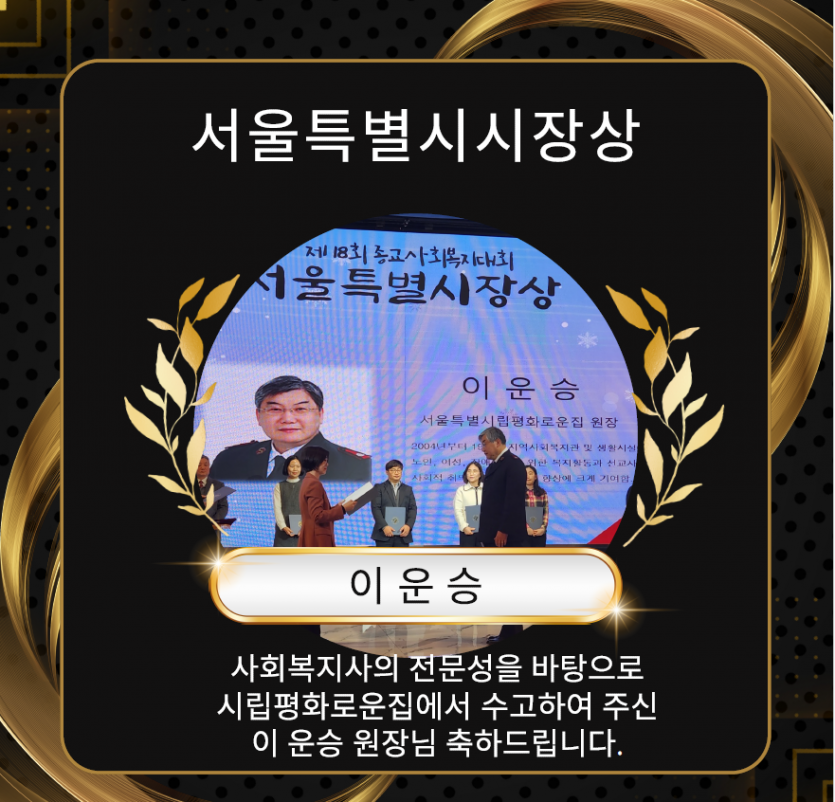 제18회 종교사회복지대회 서울특별시장상 페이지 정보 작성자 장설궁 작성일 24-01-10 11:51 조회 6,167회 댓글 0건 본문 지난 12월 27일 오후 4시 30분 서울 마포구 케이터틀에서 ‘제18회 종교사회복지대회’를 개최했습니다사회복지의 성장을 위해 헌신한 서울특별시립평화로운집 이운승 원장님께서 서울특별시시장상 수상하셨습니다. 축하드립니다. 이전글 다음글 목록
