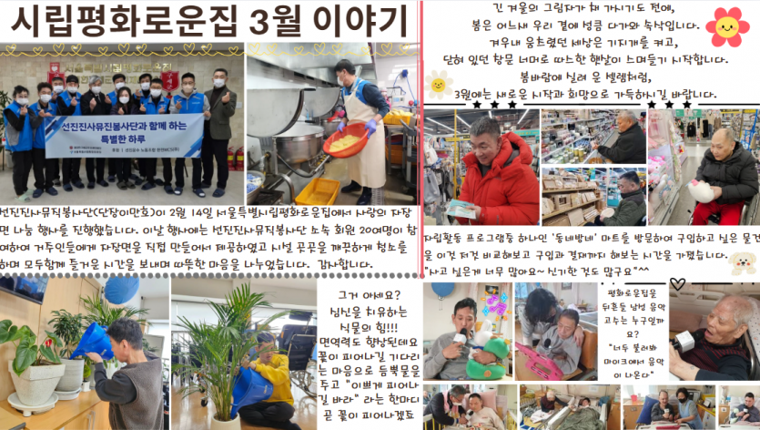 2025년 3월 시립평화로운집 후원감사편지 페이지 정보 작성자 장설궁 작성일 25-03-04 15:15 조회 4,654회 댓글 0건 본문 HELLOSPRING^^겨울의 추위를 견뎌낸 우리에게 희망과 설렘을 선물하는 3월꽃처럼 피어나는 행복을 가득 담아 보내드립니다. 이전글 다음글 목록