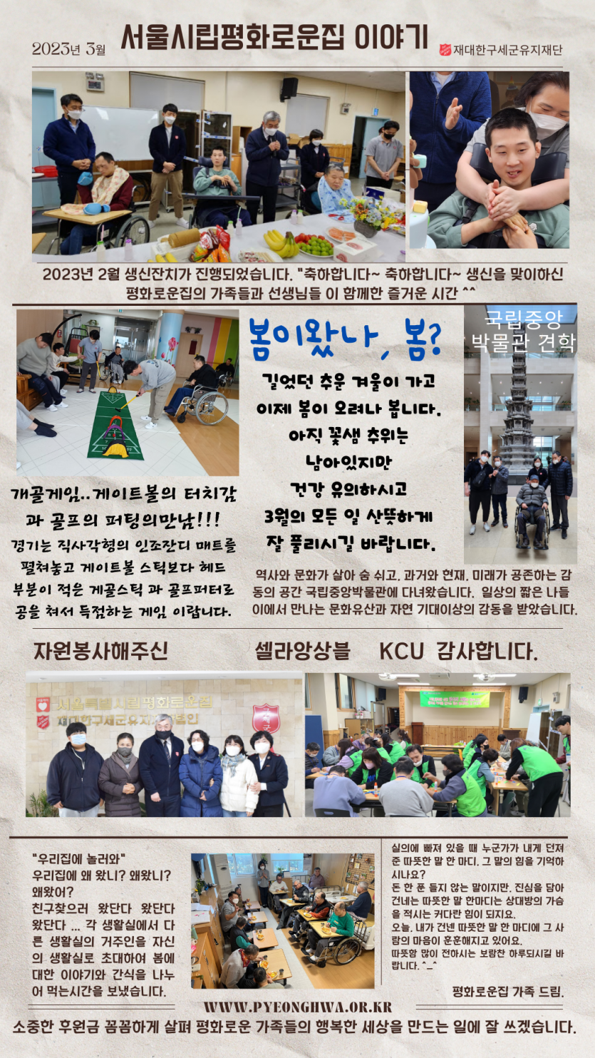 2023년 3월 후원감사편지 페이지 정보 작성자 장설궁 작성일 23-03-01 11:29 조회 10,766회 댓글 0건 본문 3월 첫날이 되었습니다. 봄맞이 준비는 잘 하셨나요? 아직은 아침 저녁으로 쌀쌀한 찬 공기가 있으니 건강에 유의하시기 바랍니다.2023년 3월 봄에는 꼭 봄을 마음껏 즐기시며 보내셨음 합니다. ^^ 이전글 다음글 목록