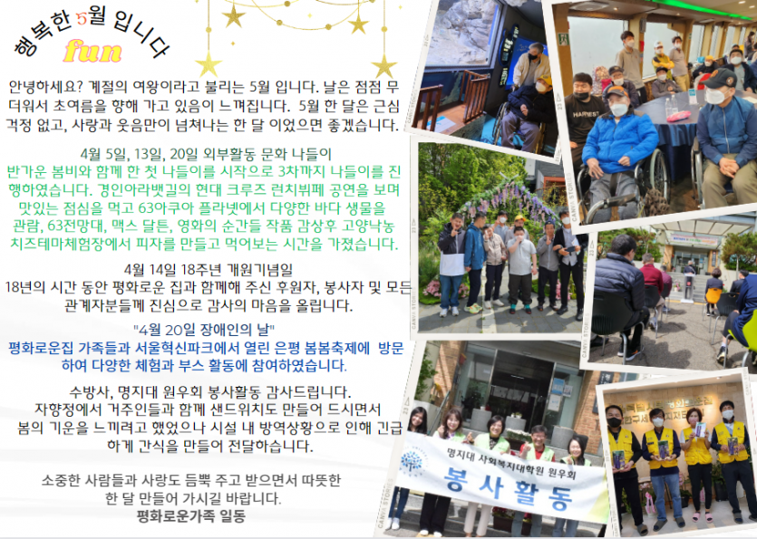 2023년 5월 후원감사편지 페이지 정보 작성자 장설궁 작성일 23-05-10 16:23 조회 10,004회 댓글 0건 본문 초록 세상 5월입니다.화사한 꽃과 함께 싱그러운 나뭇잎을 보며 마음의 평화와 기쁨을 느껴 보시길 바라며 평화로운 가족의 소식을 전해드립니다. 이전글 다음글 목록