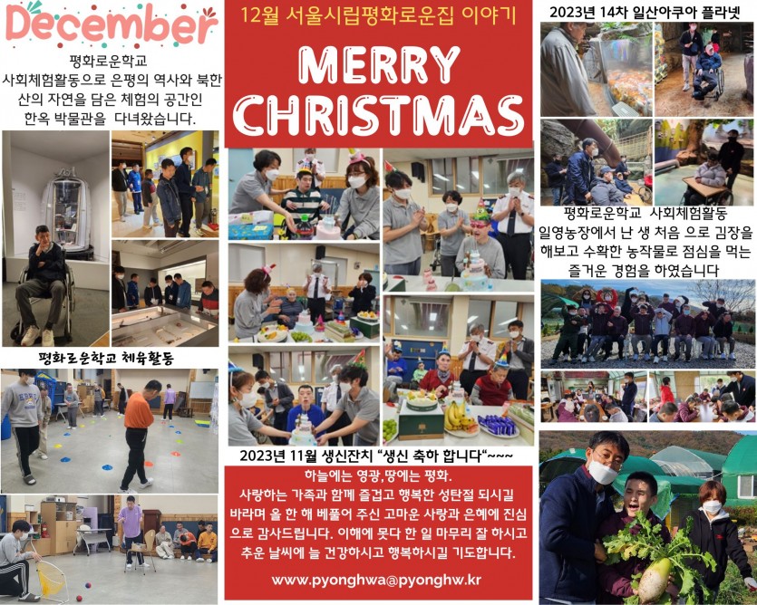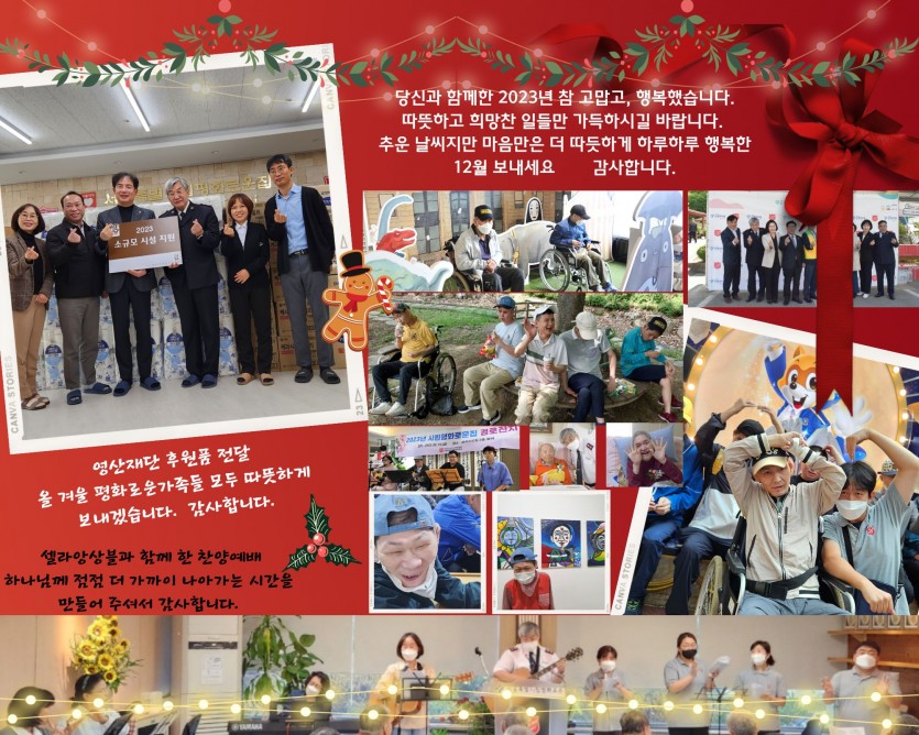 2023년 12월 후원 감사편지 페이지 정보 작성자 장설궁 작성일 23-12-11 10:58 조회 7,349회 댓글 0건 본문 12월 평화로운집 가족들 이야기어느덧 한 해를 마무리하는 12월이 되었습니다. 마음 따뜻하고 미소 지을 일이 많은 한 달이 되셨으면 합니다. 연말이라 바쁘신 일들이 많겠지만 남은 한 달 후회 없도록 마무리 잘하시고 뜻하신 일 모두 이루시길 바랍니다. 평화로운집 가족만의 행복이 아닌 모든 이들이 행복한 연말연시를 보내시길 기도하겠습니다. 좋은 사람들과 함께한다는 것은 참 행복한 일인 것 같습니다. 올 한 해 동안 후원자님들과 함께해서 행복하고 감사했습니다. 이전글 다음글 목록