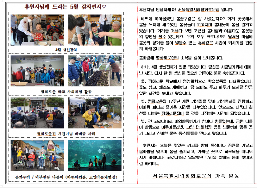 2022년 5월 후원자 감사편지 페이지 정보 작성자 장설궁 작성일 22-07-08 13:31 조회 12,079회 댓글 0건 본문 ♤ 봄향기가 향기로운 5월 이예요~~5월엔 5배로즐겁고 행복한 일들만 가득 하시길 바라며 저희 평화로운집 식구들의 소식을 전합니다.♤ 이전글 다음글 목록