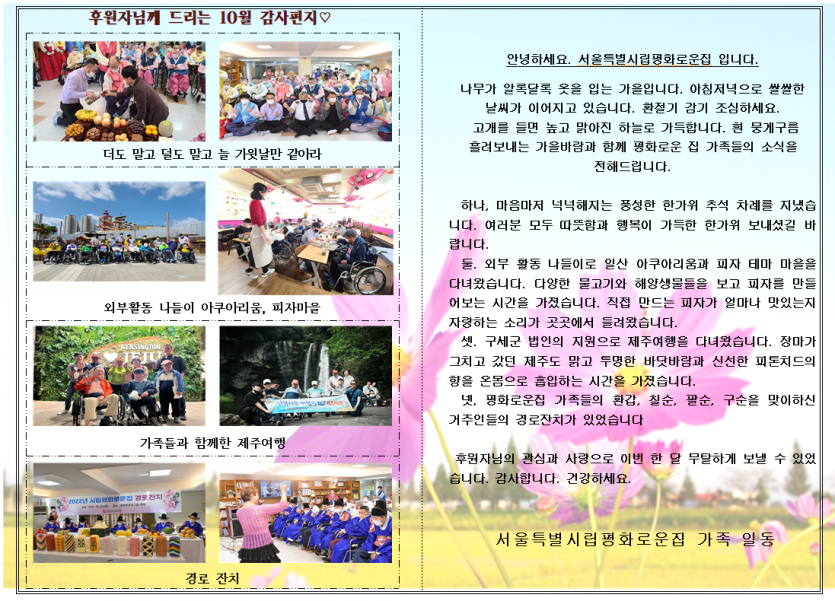 2022년 10월 후원감사편지 페이지 정보 작성자 장설궁 작성일 22-10-02 14:02 조회 11,354회 댓글 0건 본문 후원자님 안녕하세요 잘지내셨나요?아침저녁 공기가 제법 차가워진 10월입니다높고 푸른 가을 하늘과 시원한 가을바람에 기분 좋은 가을의 문턱!맑고 높은 가을 하늘처럼 늘 후원자님에게 좋은 일만 가득하길 바라며 10월 평화로운집 가족들의 이야기를 전합니다. 이전글 다음글 목록