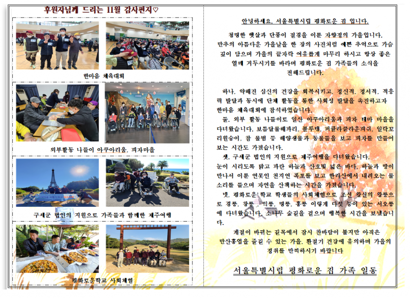 2022년 11월 후원감사편지 페이지 정보 작성자 장설궁 작성일 22-11-06 13:22 조회 10,979회 댓글 0건 본문 벌써 11월이네요.가을이 점점 깊어갑니다.화려했던 단풍들도 이제 낙엽이 되어 떨어지기 시작합니다.수북히 쌓인 낙엽길도 걸어보시면서..여유롭게 보내시면 좋겠습니다.11월도 건강하시고,하시는 모든일에 행운과 행복이 가득하시길 바랍니다.아자!아자! 화이팅! 이전글 다음글 목록