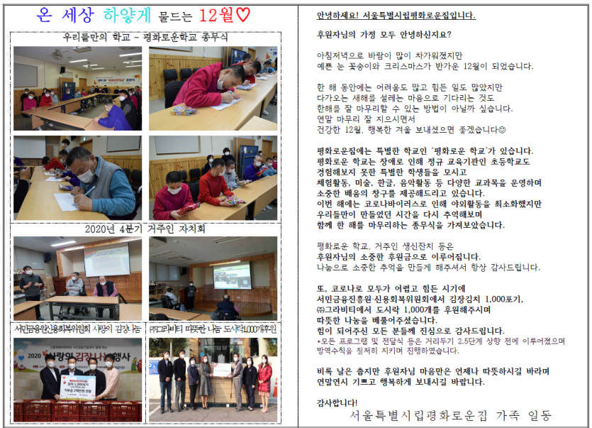 2020년 12월 후원자 감사편지 페이지 정보 작성자 박상은 작성일 21-01-21 13:38 조회 14,153회 댓글 0건 본문 2020년 12월, 크리스마스 캐롤 울려퍼지는 설레는 겨울에 늘 나눔으로 함께해주시는 후원자님께감사의 편지를 올립니다. 이전글 다음글 목록