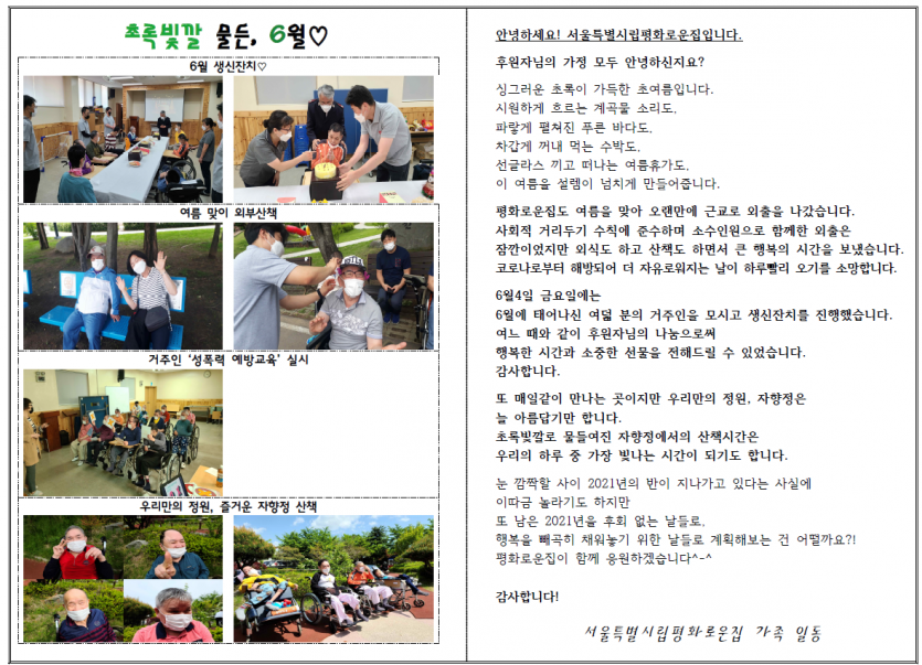 2021년 6월 후원자 감사편지 페이지 정보 작성자 박상은 작성일 21-06-25 16:47 조회 14,001회 댓글 0건 본문 초록빛깔 물든 6월항상 사랑으로 함께 해주시는 후원자님의 나눔에 감사드리며,감사의 편지를 올립니다. 이전글 다음글 목록