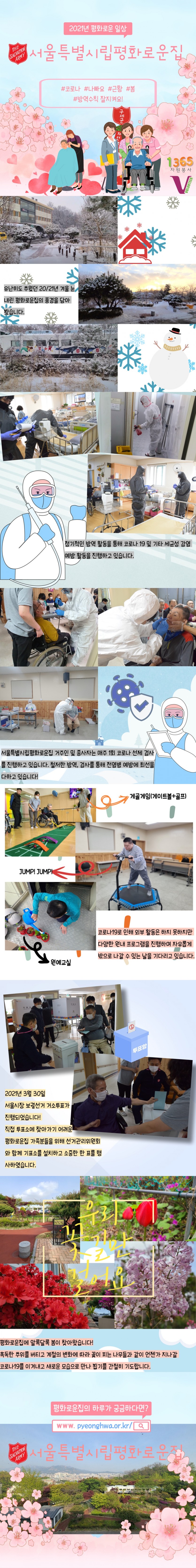 서울특별시립평화로운집 4월 카드 뉴스! 페이지 정보 작성자 박성호 작성일 21-04-23 17:26 조회 17,039회 댓글 0건 본문 코로나19로 인해 오랜 기간 시립평화로운집을 방문하지 못한 봉사자님을 위해 최근 근황을 카드뉴스를 통해 전해 드리고자 합니다.앞으로 지속적으로 업로드될 예정이니 많은 관심 부탁드립니다~~ ^3^ 이전글 다음글 목록